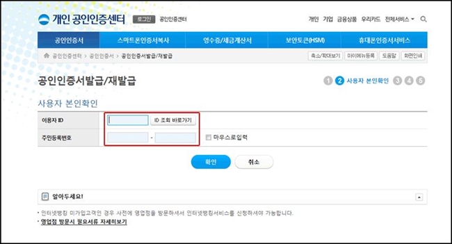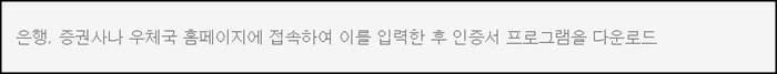은행, 증권사나 우체국 홈페이지에 접속하여 이를 입력한 후 인증서 프로그램을 다운로드합니다.