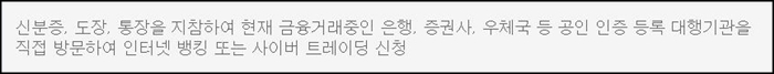 신분증, 도장, 통장을 지참하여 금융거래중인 은행, 증권사 우체국 등 공인인증 등록 대행기관을 직접 방문하여 인터넷 뱅킹 또는 사이버 트레이딩을 신청합니다.