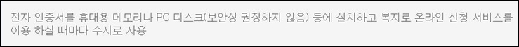 전자 인증서를 휴대용 메모리나 PC 디스크(보안상 권장하지 않음) 등에 설치하고 복지로 온라인 신청 서비스를 이용 하실 때마다 수시로 사용하시면 됩니다.