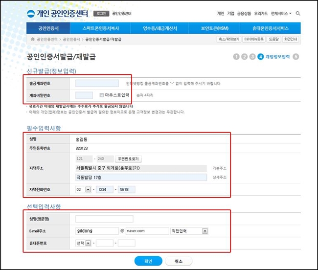 계좌정보 등 인증서 발급에 필요한 정보를 입력합니다.