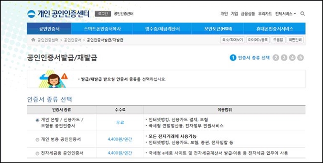 인증서 종류를 선택한 후 약관에 동의합니다.