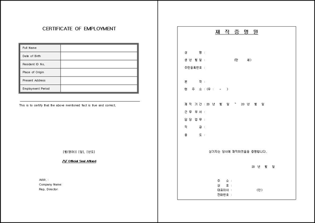 재직증명서란 '근로자가 해당 기관에 근무함을 증명할 때 사용하는 서식'입니다. 공공기관에 근무하고 있을 경우에는 정부24 홈페이지에서, 4대보험이 가입된 일반기업의 경우에는 '국민연금공단'에서 인터넷발급이 가능하기도 합니다. 다만, 회사에 요청하거나 직접 작성해야 할 경우네느 재직증명서 양식이 필요합니다. 그럴 경우 아래의 재직증명서 양식 HWP 파일을 다운로드 하시어 활용하시면 됩니다.