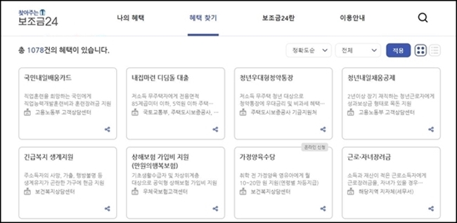 그외에도 혜택 찾기를 통해 다양한 정부 헤택을 검색해보실 수 있습니다. 내집마련 디딤돌 대출, 청년우대형청약통장, 근로장려금 등 다양한 혜택에 대한 정보가 있으오니 참고하시기 바랍니다.