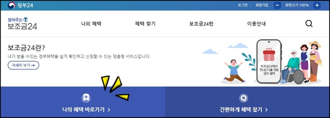 홈페이지 메인화면을 보시면 '나의 혜택 바로가기'가 있습니다. 우리가 받을 수 있는 정부 혜택이 어떤 것이 있는지 확인하기 위해 클릭해봅니다.