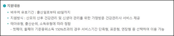 - 지원방식 : 산모의 산후 건강관리 및 신생아 관리를 위한 가정방문 건강관리사 서비스 제공