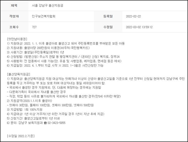 저는 '서울 강남구 출산지원금' 게시글로 이동해보았습니다. 강남구에서 지원하고 있는 출산지원금인 첫만남이용권, 출산양육지원금에 대한 정보를 확인할 수 있습니다.