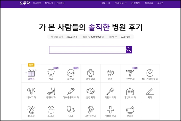 저는 '모두닥' 홈페이지의 후기들을 꽤 많이 참고하는 편입니다. 아래와 같이 모두닥 홈페이지에서는 치과 뿐만 아니라, 피부과, 성형외과 등의 정보와 후기들을 제공하고 있습니다.