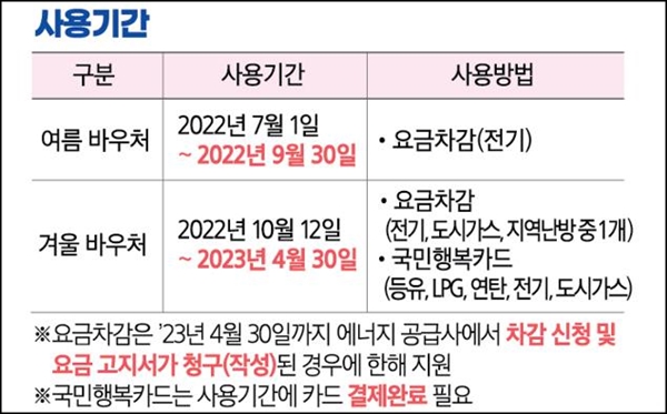 - 겨울 바우처 : 2022년 10월 12일 ~ 2023년 4월 30일 / 요금차감, 국민행복카드